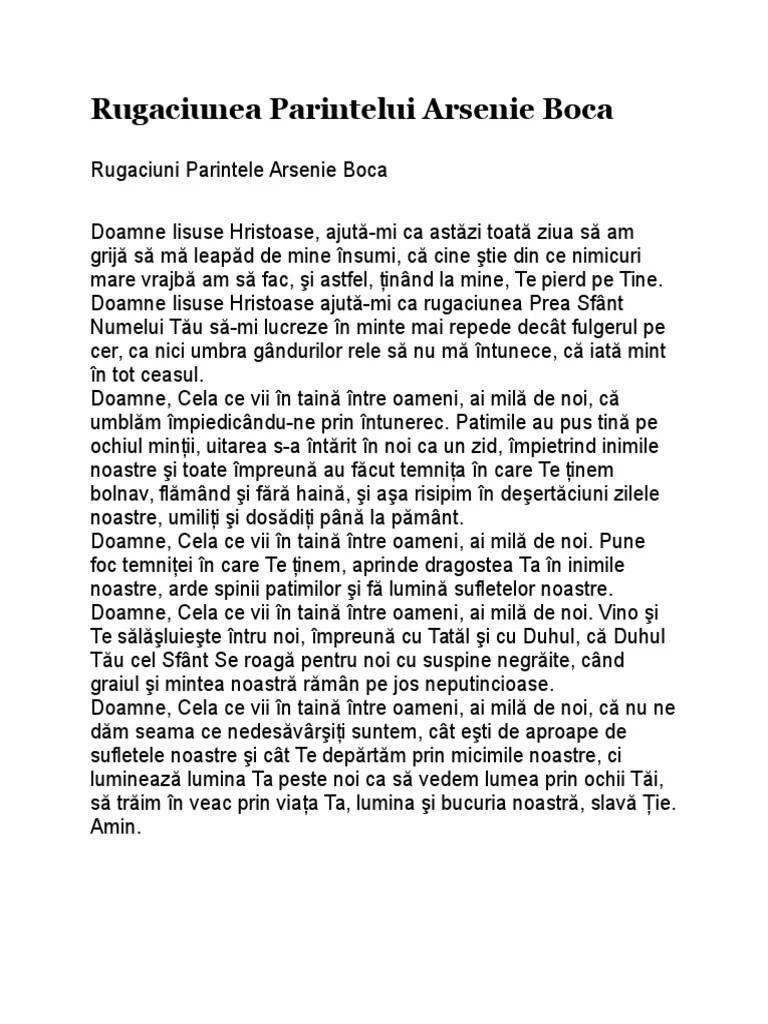 In numele tatalui si al fiului si al sfantului duh, amin. Și nu ne duce pe noi în ispită, ci ne izbăvește de cel rău. Arsenie boca se numără printre cele mai populare personaje creștine din istoria recentă a româniei. „pacea sufletului aduce pacea trupului" spunea părintele arsenie boca.
