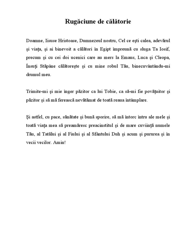 Rugăciune de lăsare în voia lui dumnezeu şi a maicii domnului... Rugăciunea părinților pentru luminarea minţii copilului. Doamne, iisuse hristoase, dumnezeul nostru, cel ce eşti calea, adevărul şi viaţa, şi ai călătorit împreună cu cei doi ucenici care mergeau la emaus, însuţi, stăpâne, călătoreşte şi cu copilul … Însuți stăpâne, călătorește și cu mine, robul tău, binecuvântând călătoria … Rugăciune către sfântul mare mucenic mina, pentru ajutor la găsirea lucrurilor pierdute. Rugăciune pentru izbăvirea de vrăjmași. Rugăciune de lăsare în voia lui dumnezeu şi a maicii domnului. Rugăciune de călătorie pentru copii. Doamne, iisuse hristoase, dumnezeul nostru, cel ce eşti calea, adevărul şi viaţa, şi ai călătorit împreună cu cei doi ucenici care mergeau la emaus, însuţi, stăpâne, călătoreşte şi cu copilul acesta, binecuvântând călătoria sa.. „doamne, iisuse hristoase, dumnezeul nostru, cel ce eşti calea, adevărul şi viaţa, şi ai călătorit împreună cu cei doi ucenici care mergeau la emaus, însuţi, stăpâne, călătoreşte şi cu copilul acesta, binecuvântând călătoria …