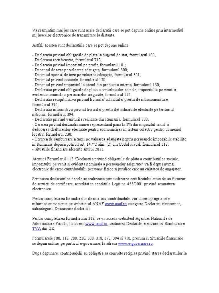 Continutul acestui site este proprietatea agentiei nationale de administrare fiscala. .. V a reamintim mai jos care sunt acele declaratii care se pot depune online prin intermediul mijloacelor electronice de transmitere la distanta.