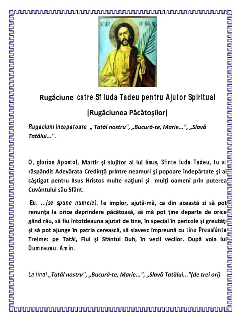 O, sfinte iuda tadeu, ruda a domnului nostru iisus hristos, apostol si martir glorios, stralucit in virtuti si puternic in minuni, credincios si grabnic ajutator al celor ce te.. .. 19.06.2020 · sfantul apostol iuda tadeu, ruda domnului grabnic ajutător al celor fără speranță, ajutător în situații aparent imposibile, fără ieşire, disperate (19 iunie) … mai întâi sunt rugăciunile începătoare … troparul.