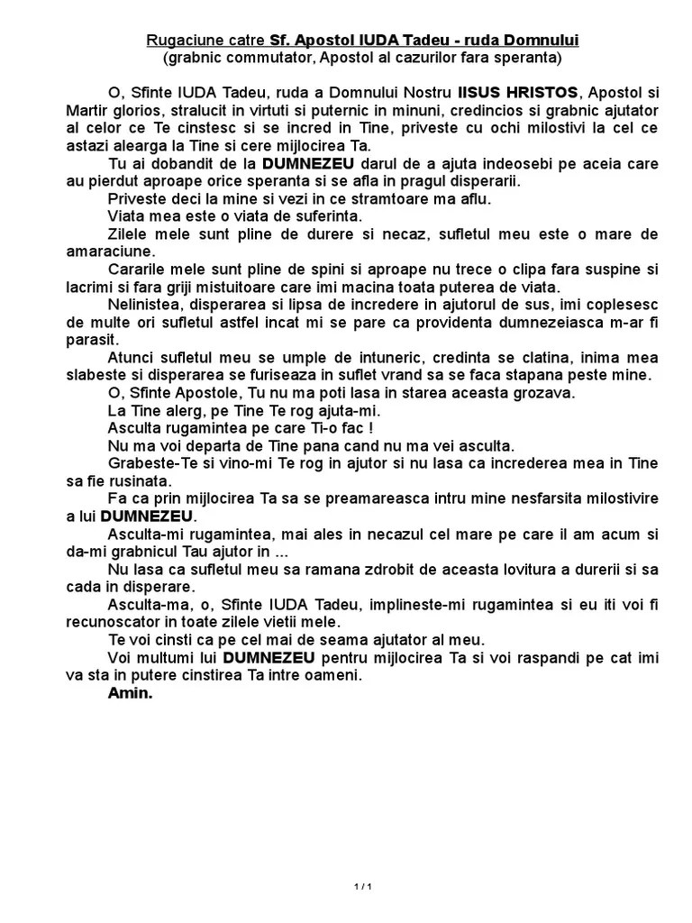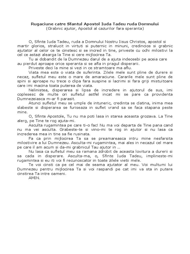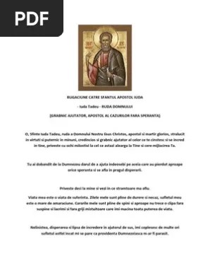 Potrivit calendar ortodox 2019, pe data de 19 iunie credinciosii il cinstesc pe sfantul apostol iuda tadeu, fartele lui iacov. 18.06.2018 · rugăciune către sfântul apostol iuda tadeu, grabnic ajutătoare pentru cei fără speranță. Amin binecuvantata fie inima sfanta a lui iisus binecuvantata fie. Rugaciune catre sf iuda tadeu in incercari si necazuri. 08.04.2018 · rugaciunein numele tatalui si al fiului si al sfantului duhsfant iuda apostol fidel servitor si prieten al lui iisus biserica te onoreaza si te invoca ca u. Troparul sfântului apostol iuda, ruda domnului, glasul 1: Rugaciune catre sf iuda tadeu pentru copilul bolnav. Rugaciune catre sf iuda tadeu pentru ajutor spiritual.. Rugaciune catre sf iuda tadeu pentru ajutor spiritual.