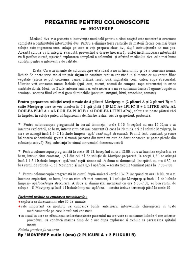 Pregătirea pentru colonoscopie pregătirea pentru colonoscopie este o etapă premergătoare colonoscopiei care constă în curățarea colonului pentru ca acesta să poată fi explorat corespunzător.. Farǎ o pregatire adecvatǎ, examinarea nu va decurge in condiţii optime si poate fi nevoie de repetarea acesteia. Din acest motiv este foarte important sa cititi instructiunile de … Vizualizarea bună a lumenului și a pereților intestinali depinde foarte mult de complianța pacientului la pregătire. In unele cazuri medicul nu va putea trece cu endoscopul prin intregul colon, pana la nivelul jonctiunii cu intestinul subtire. In aceste cazuri ar putea fi posibil sa fie nevoie de o alta …. Pregătirea pentru colonoscopie care se va efectua după amiaza.